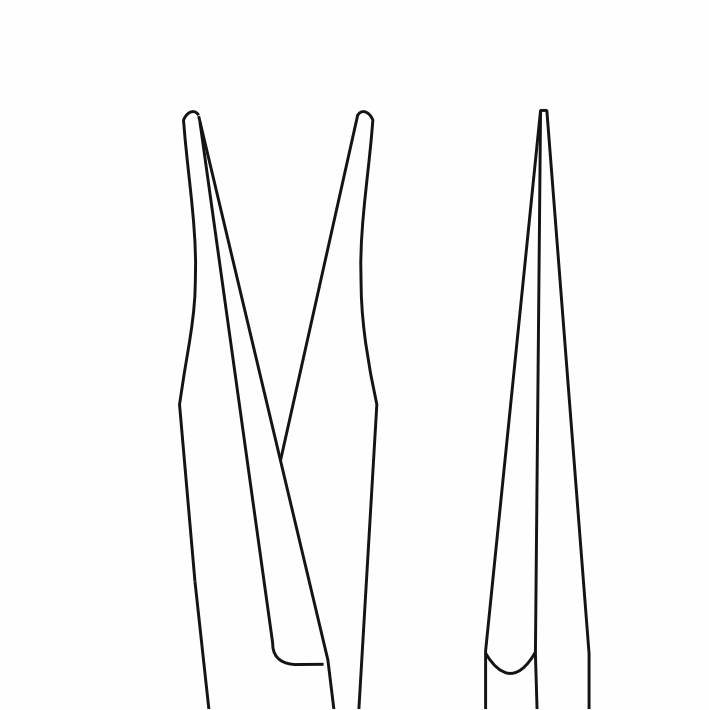 Общая длина: 105 мм Рабочая часть: острая, изогнутая, Кончики: длина 11.5 мм, ширина 0.3 мм Ручка: плоская, стальная, ширина 7 мм
