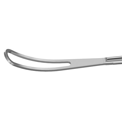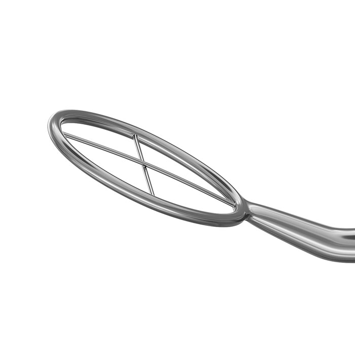 Общая длина: 120 мм Рабочая часть: стальная Кончик: 6 x 9 мм, с перекрестием Ручка: круглая, титановая, Ø5 мм Используется для выведения хрусталика из глаза при экстракции катаракты.