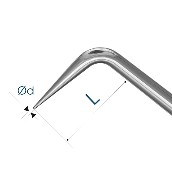 Общая длина 112 мм - Стальной кончик d = Ø0.25 мм длиной L = 1.25 мм от кончика до сгиба - Круглая титановая ручка Ø5 мм |